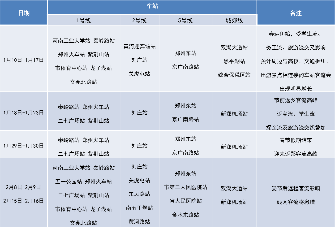 春運(yùn)期間,車站將根據(jù)具體客流變化適時(shí)啟動(dòng)客流控制措施,請(qǐng)廣大乘客合理安排出行時(shí)間,盡量錯(cuò)峰出行。請(qǐng)不要攜帶煙花、爆竹違禁品進(jìn)站乘車。鄭州地鐵在春運(yùn)期間將密切關(guān)注天氣變化,針對(duì)惡劣天氣做好預(yù)判和準(zhǔn)備工作,并迅速啟動(dòng)保障方案。乘坐地鐵時(shí),您還可以通過鄭州地鐵運(yùn)營(yíng)全媒體客服平臺(tái)及時(shí)獲取運(yùn)營(yíng)動(dòng)態(tài)。